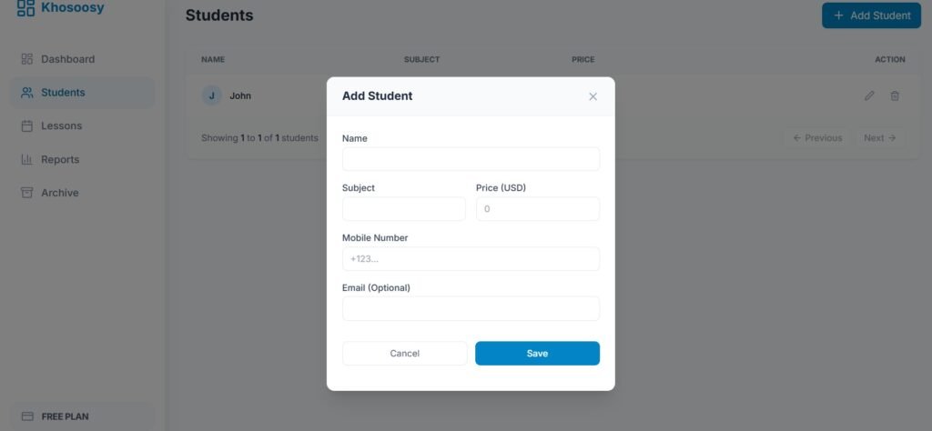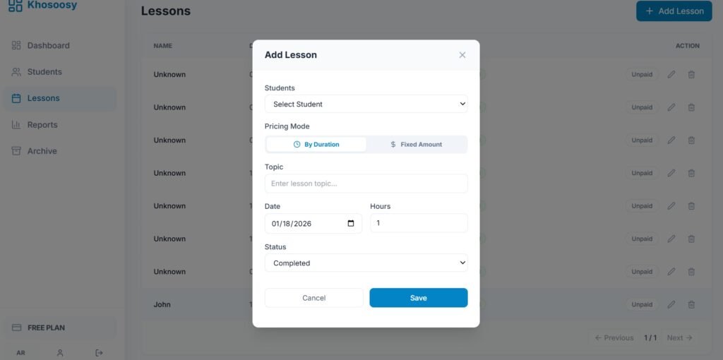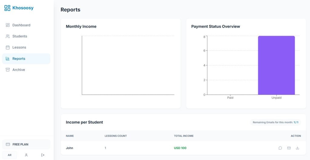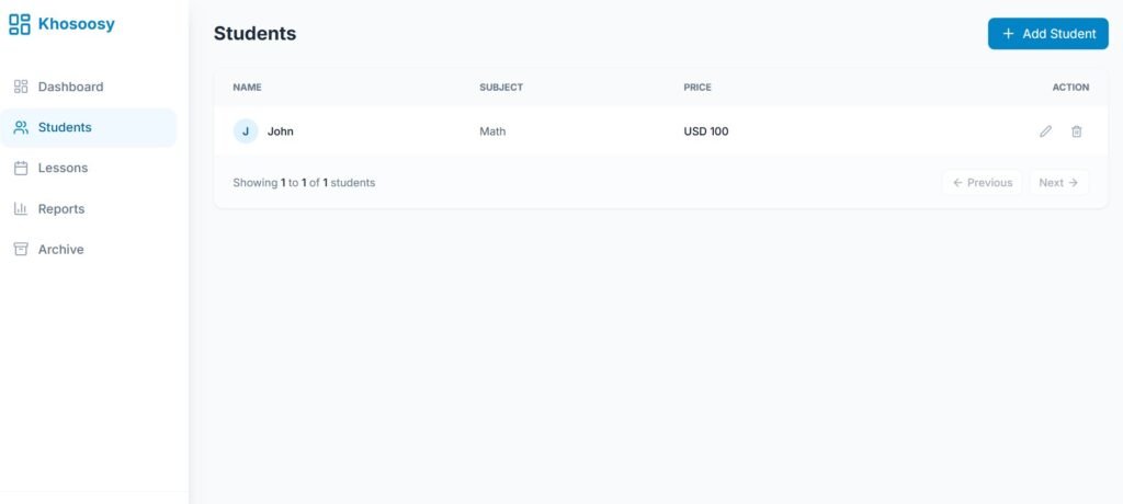 khosoosy.com هو موقع مخصص للمدرسين والمدربين يساعدهم على تسجيل وتنظيم الحصص الخصوصية التي يقدمونها لطلابهم، مع توفير تقارير وتحليلات مفصلة توضح عدد الحصص، حضور الطلاب، وتكلفة كل طالب، مما يسهل إدارة العمل والمتابعة المالية والتعليمية بشكل منظم.